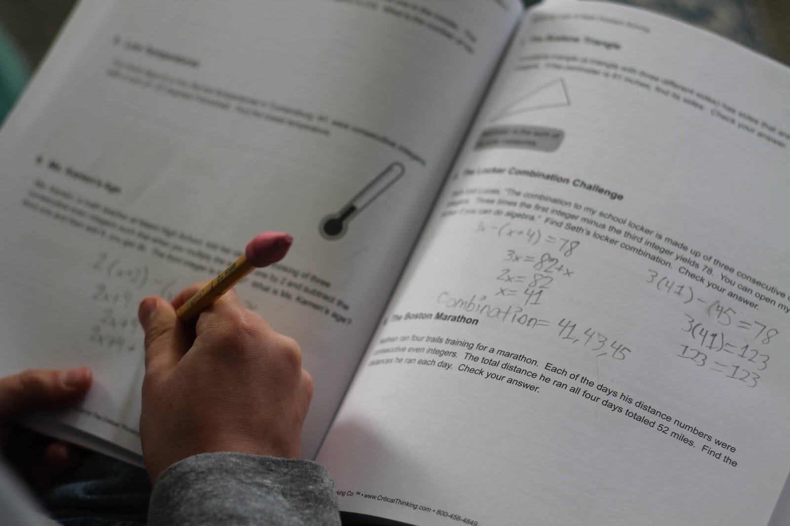 JP: I think my favorite ones were the Consecutive Integer problems, they're really fun. So one of the examples is "For three days in a row, the low temperatures in Trumansburg, New York, were consecutive integers with the sum of -27 degrees Fahrenheit. Find the lowest temperature." And you would do, "X + (X+1) + (X+2)= -27, and then you would remove the parentheses because of this mathematical property, I think it's the associative property of addition, and then you combine like terms, and then you subtract six from both sides... Wait... No... You subtract three from both sides... And then you divide both sides by three and then you get your answer, which is -10 degrees Fahrenheit.