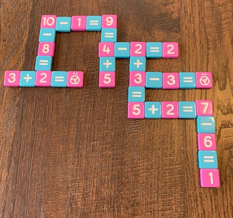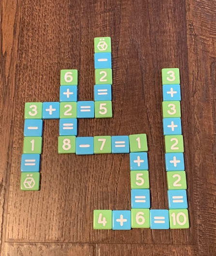 Our game contains 3 groups of tiles: 48 double-sided operation tiles in blue, 19 purple number tiles and 19 green number tiles (86 total tiles). The green and purple tiles have the exact same grouping of numbers ranging from 1-10, including 2 wild tiles in each color. There are 3 different blue operation tiles: +, -, and =. The 6 and the 9 tiles look identical and are interchangeable so use them as you wish!