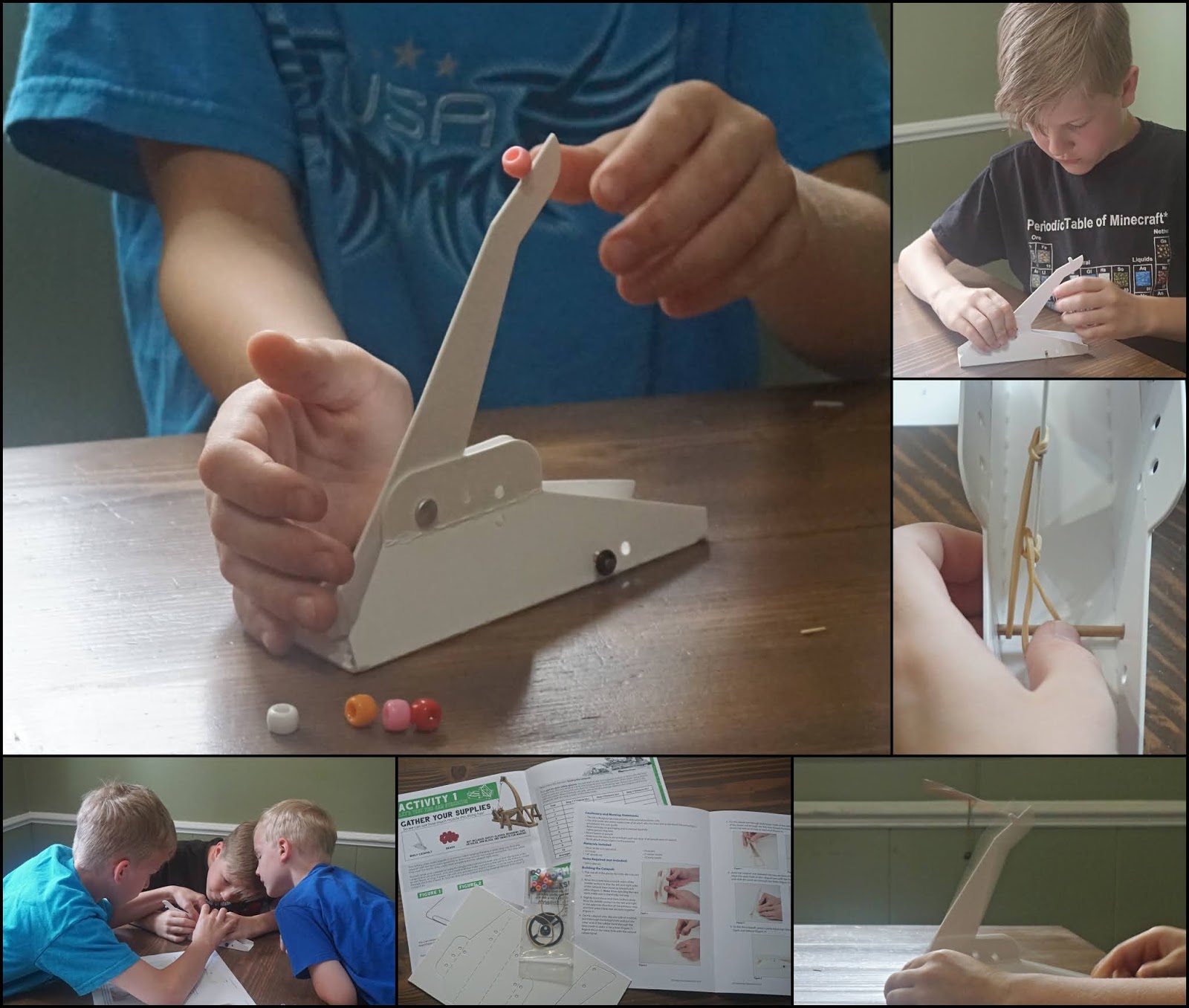 We still have one final project to complete. They saved their favorite for last--creating their own inventions, which opens up all possibilities for creativity. The kit comes with tons of provided materials like chipboard, string, clay, spools, rubber bands, and straws, but encourages the use of any supplies. There are a few suggested inventions, but the main purpose is getting kids to come up with ideas--whether it's improving something or creating an entirely new concept--and then creating them. I know that my boys will spend days being engineers and testing their contraptions.