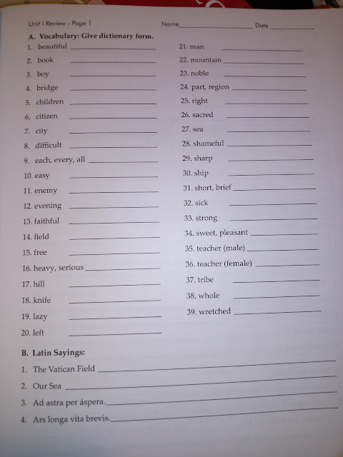 Following the lesson, Ashleigh beings working in her workbook. Each lesson has four worksheets sections that she works on over the course of the four days, so one worksheet each day. These worksheets review previously learned material both in First Form Latin as well as the 2nd Form course. These worksheets include word study, grammar, vocabulary, declensions, forms, diagramming sentences and more. Ashleigh typically works on one page each day in addition to listening to the audio cd and reviewing flash cards. So on days 2-4, she begins with doing her recitation, followed by a section of her workbook. The teachers guide makes it easy for me to guide her through the recitations and review by giving me a list of what to ask her to recite while the notes in the teachers guide that correspond with her text book makes it much easier for me to have an idea of the concepts she's working on so that I can help her when necessary.