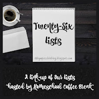 Welcome to Twenty Six Lists! I hope you'll join me in using some fun List prompts for writing. Every other week I'll share a writing prompt and invite you to link up your list, and wherever the prompt takes you. You may want to simply make a list of five or ten items that answer the prompt, or you may elaborate on the items in your list, or even write an entire article. Be creative, and have fun!