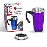 Affordable - Modern stylish design the insulated travel coffee mug with handle and lid comes in 4 colors blue green orange purple It features a modern and cool design with a sturdy and reliable handle that protects your hands from the hot beverage Use this premium coffee cup for coffee tea hot cocoa or any other hot drink Easy to use our coffee cups with handle have a practical design that can be used with a single hand The slide to open lid lock is leakproof so you dont have to worry about staining your clothes gadgets or important files The insulated cup fits perfectly in the car holder