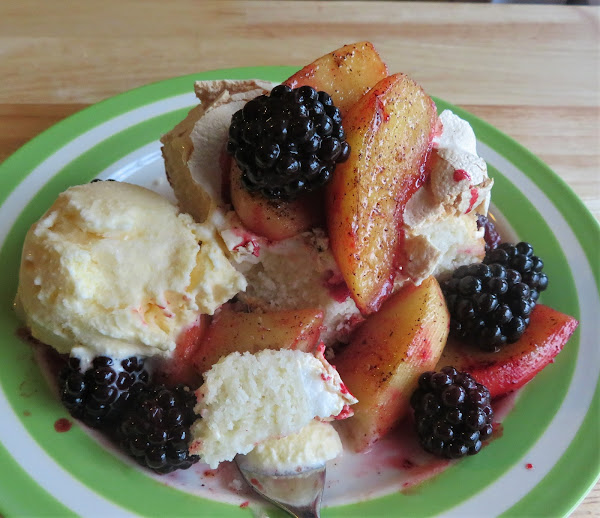 Once they have softened slightly and begun to caramelize you throw in some blackberries and take it off the heat. The blackberries cook only the slightest in the heat of the pan, maintaining the integrity of their shape, etc.
