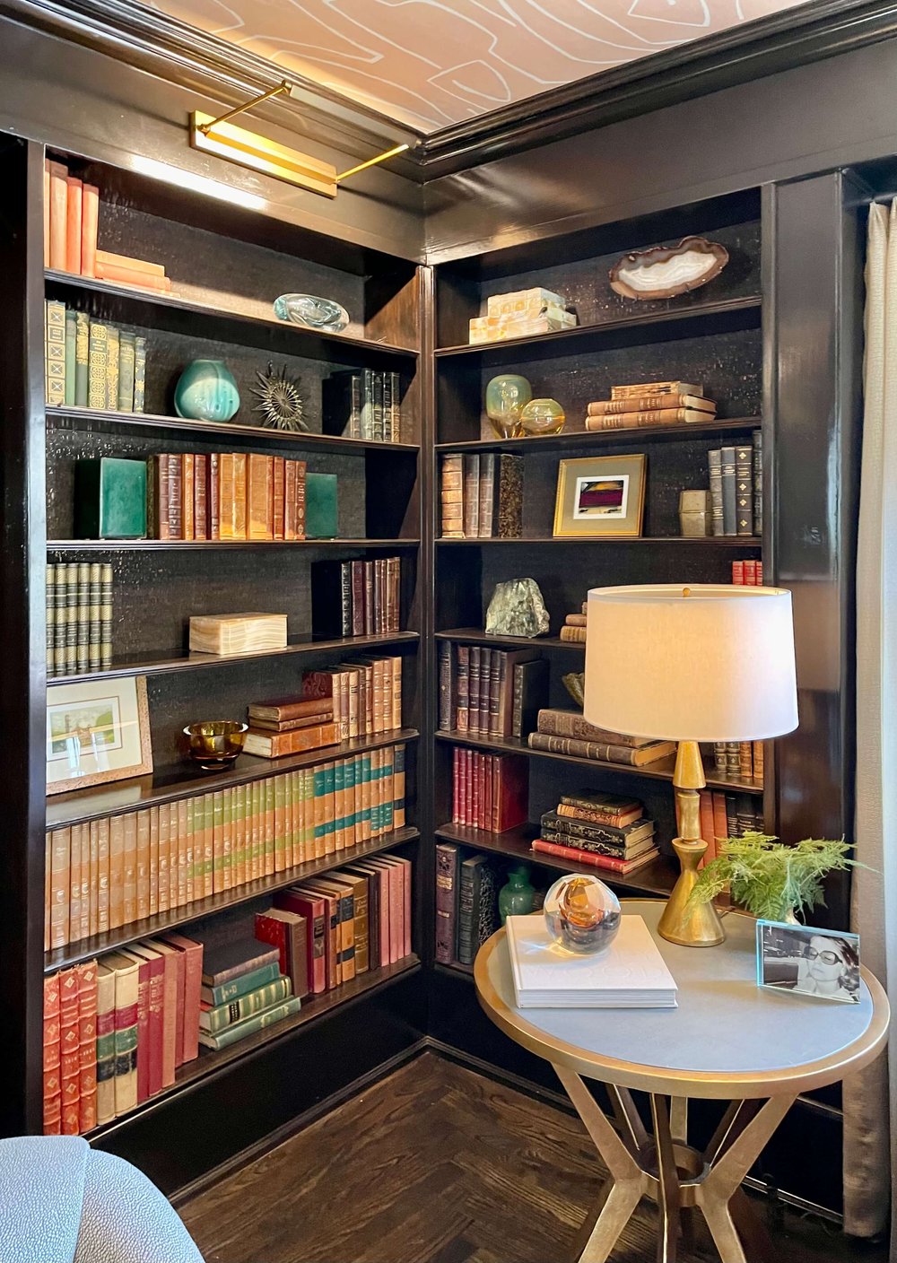 What a handsome library this was with lots of special details! Wallcovering on the ceiling and in the backs of the bookcases made for such a luxurious look.