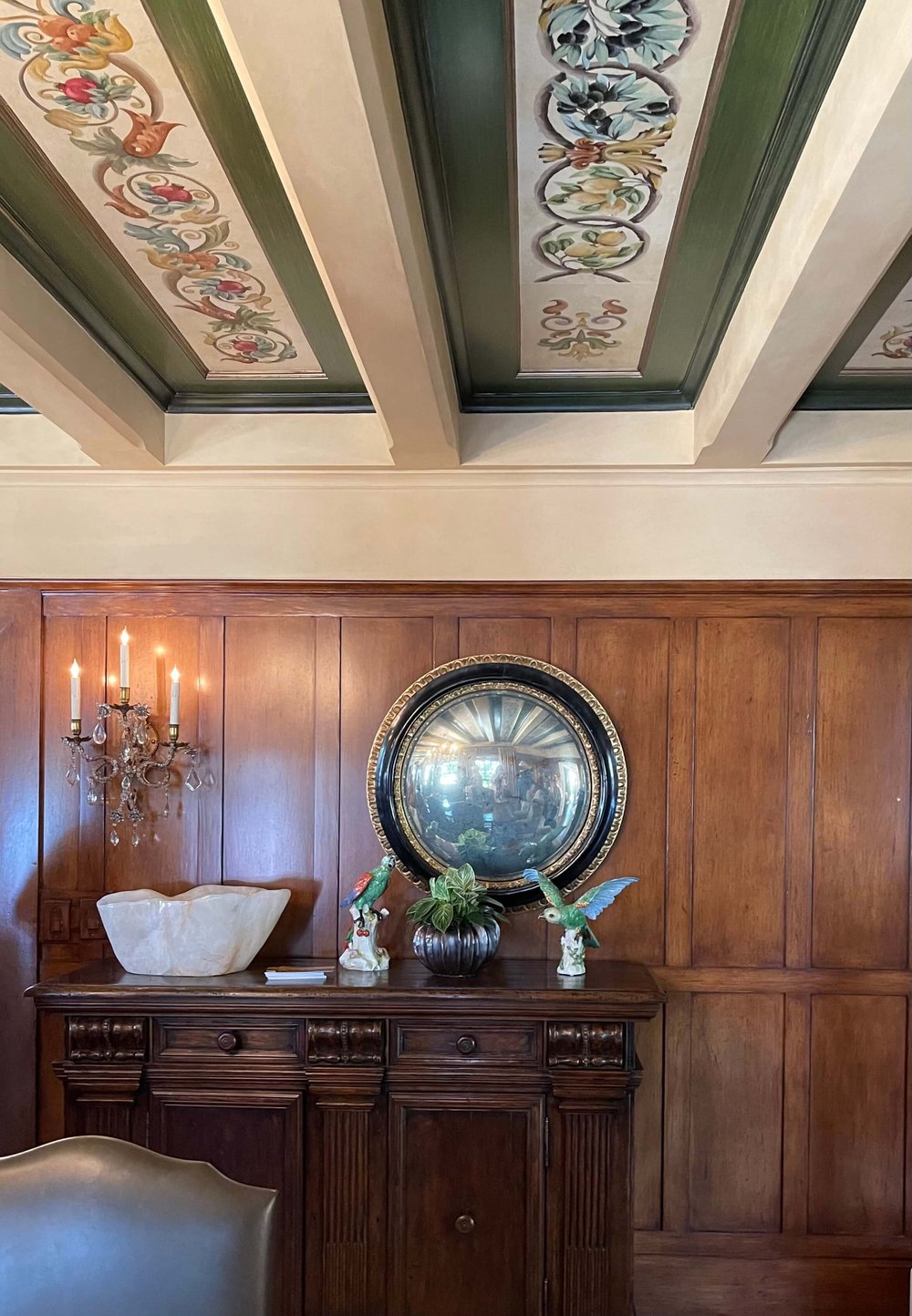 A decorative ceiling compliments the wood paneling in the dining room, designed by Louise O’Malley Interior Design, Pasadena Showcase House of Design.