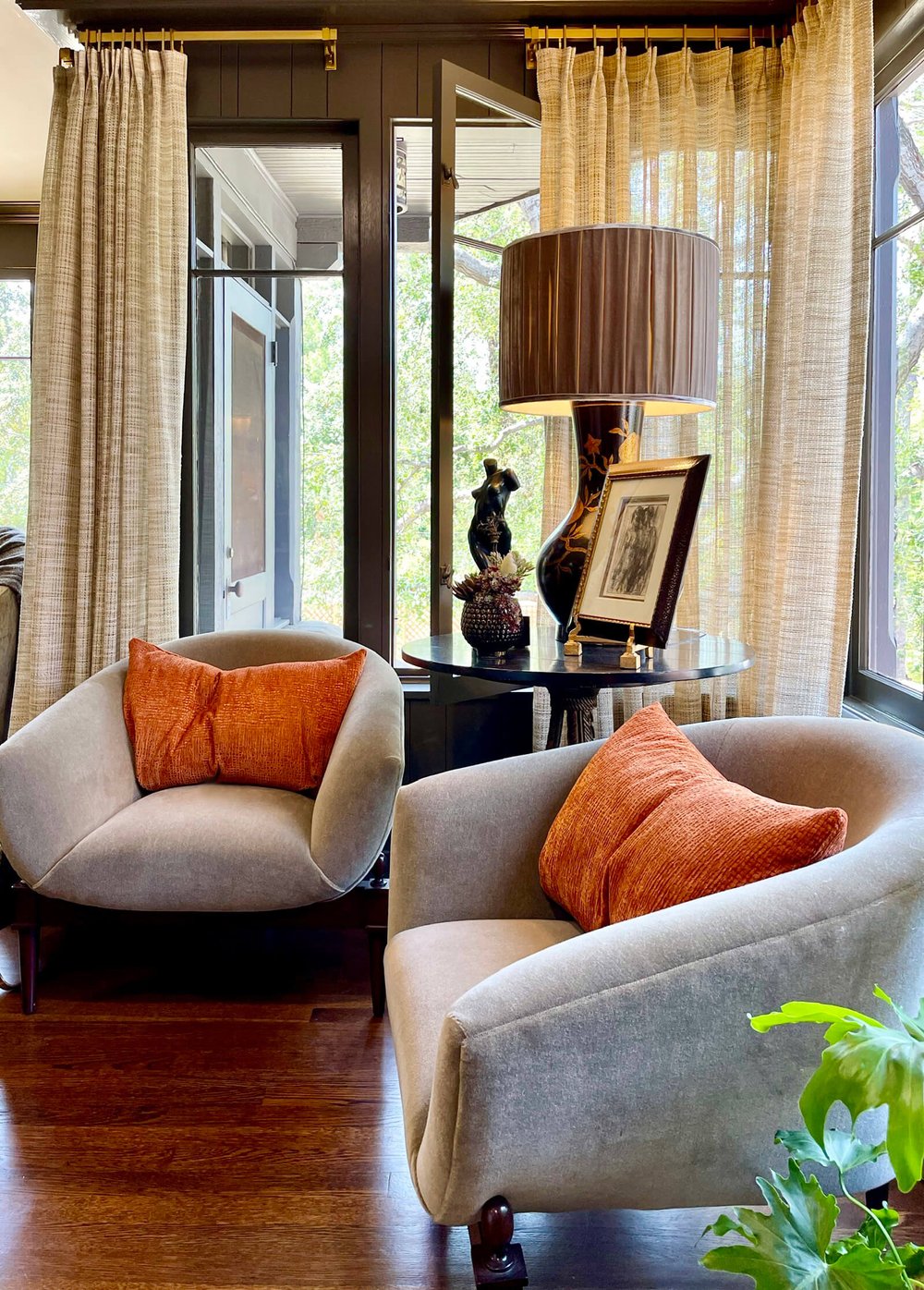 Comfy chairs in a corner of the family room looked inviting with their spot of color. Family room designed by Tocco Finale Home, Pasadena Showcase House of Design.