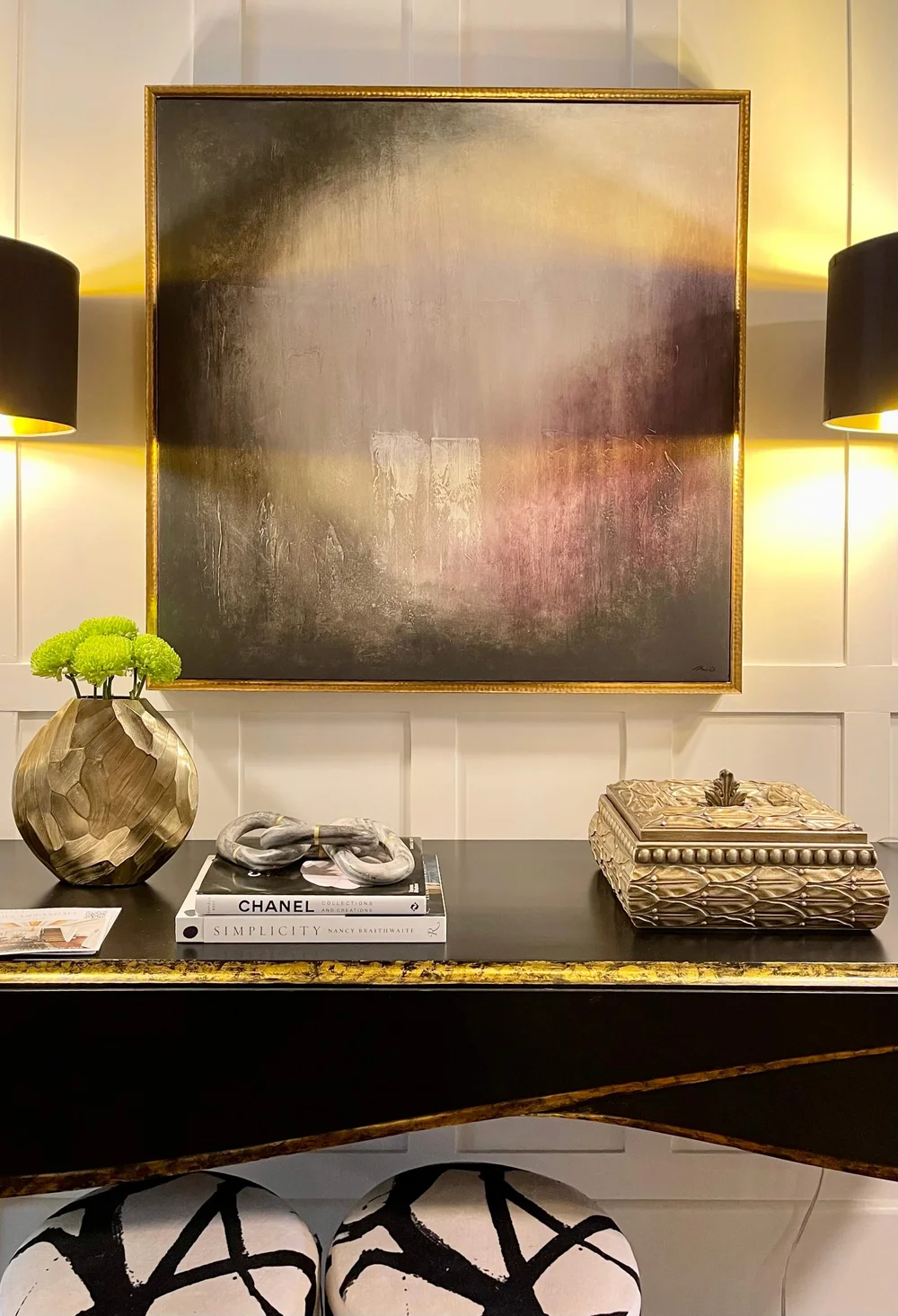The art adds a vibrant note in this sunroom designed by James Hernandez Interior Design, Pasadena Showcase House of Design.
