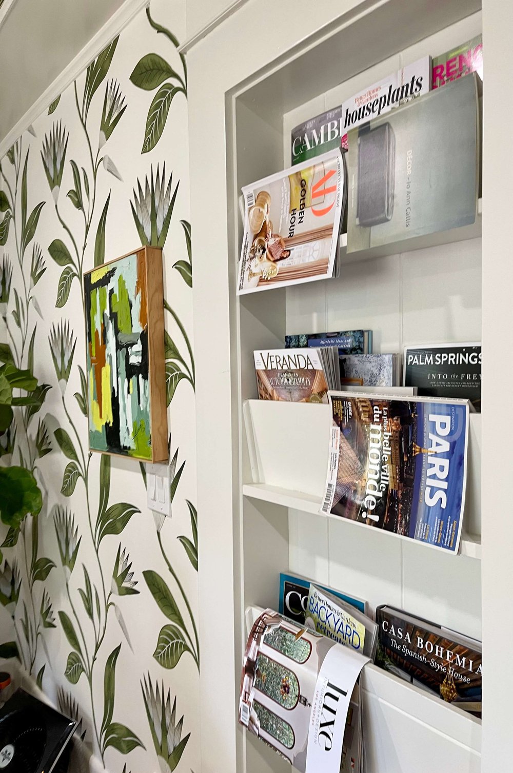 This space was designed by Stephanie Hatten of SH Interiors and besides books, featured a dramatic colorful sofa and a beautiful bar with bistro shelving. All such nice custom touches that combined beautifully.