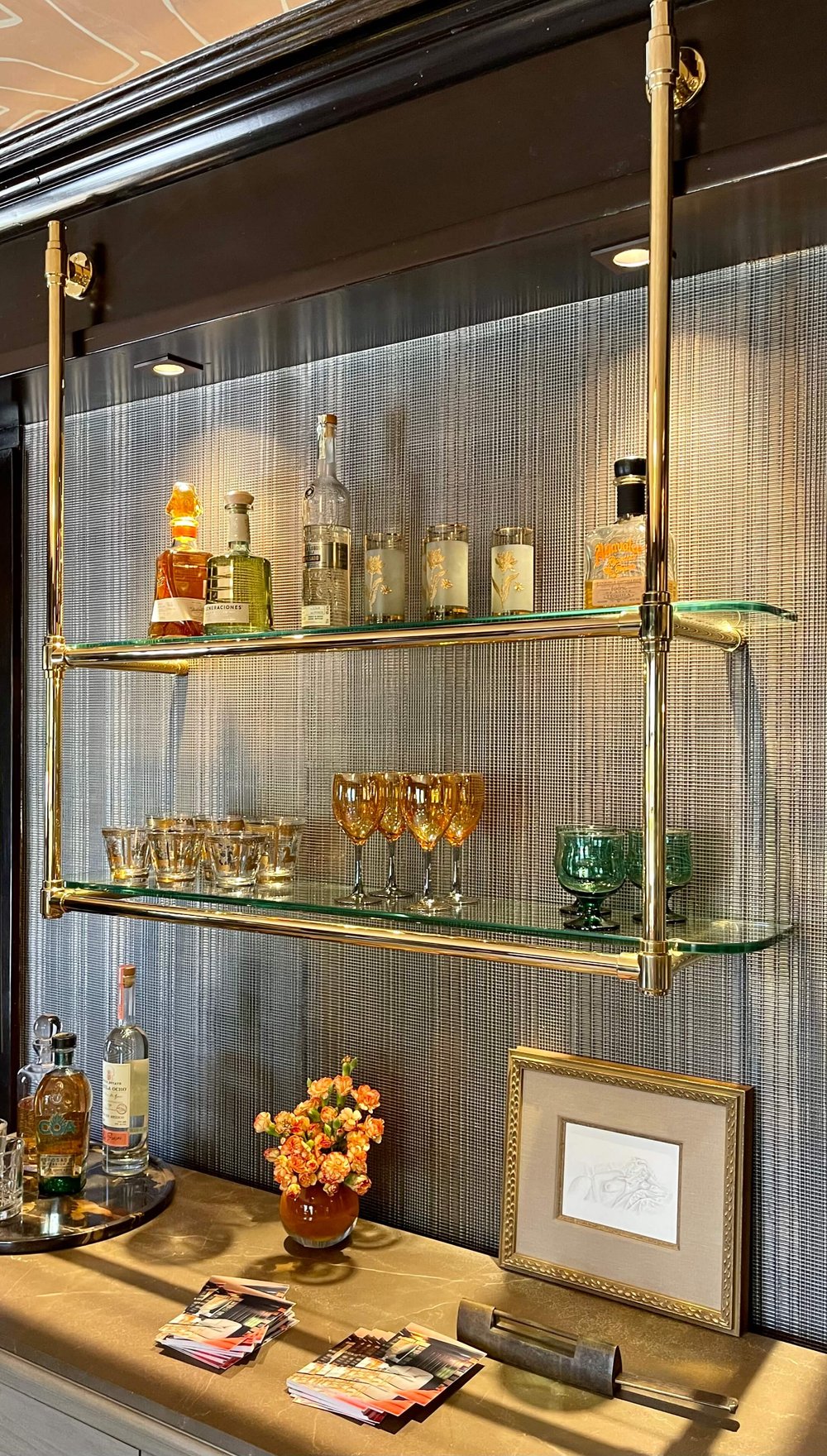 Bistro shelving at the bar in the library add some glam to this space. Library designed by Stephanie Hatten of SH Interiors, Pasadena Showcase House of Design.