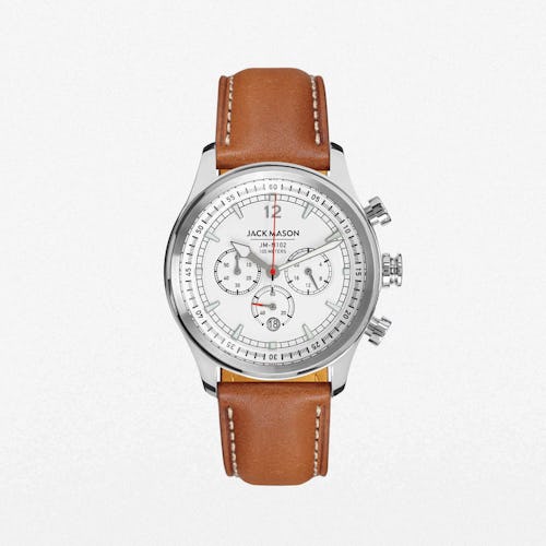 Don’t let the budget price mislead you, the Halyard packs handsome style and features you’ll actually use into a durable package. The dial’s white face makes it easy to read during the day, with glowing markings for nighttime visibility. The organized face shows the time, stopwatch, date, and 24-hour time. Water-resistant down to 100 meters, the watch is sporty enough to wear daily, with an Italian leather band that dresses it up effortlessly.