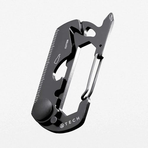 A stainless steel tool that makes sure he's prepared for anything. And we do mean anything. It's a carabiner, box cutter, Philips driver, flathead driver, keychain, hex wrench, wire cutter, ruler, bottle opener and bicycle tool. It fits in the palm of his hand, and hangs from either his jeans, or a bag.