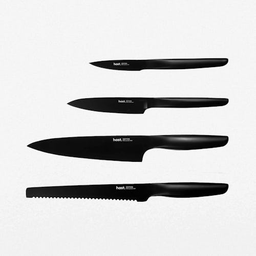 Stamped from a single piece of stainless steel, this sleek knife set is too handsome to bury in a knife block or drawer — especially if you pick the black or gold titanium coating. You might want to get a magnetic rack. You’ll use the big 8-inch chef’s knife for daily chopping and slicing, the shorter 5-inch knife for smaller veggies or maybe cheese, and the paring knife for detailed work like hulling strawberries. The Japanese-style blade, beveled on one side like a sword, excels at making long, clean slices.