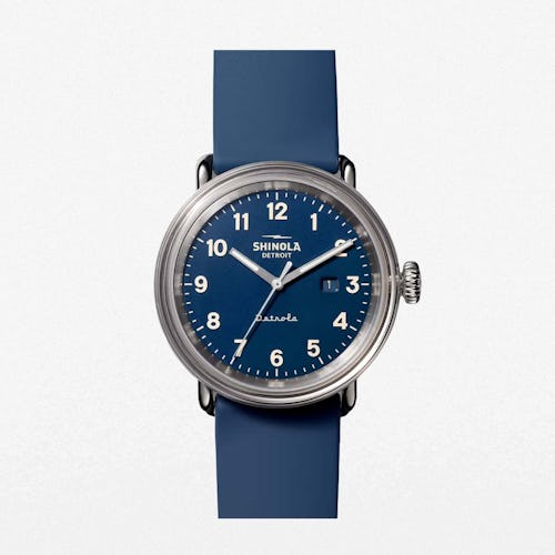 Proving a daily wear watch doesn’t have to be boring, the Detrola has a colorful navy dial and easy-to-read face, with time and date, that that goes with everything from a suit to gym clothes. Underneath the hood is an accurate quartz movement assembled in Detroit with parts from Switzerland. This anti-smartwatch comes with a silicon strap that pops off easily so you can swap in other bands to change up the look.