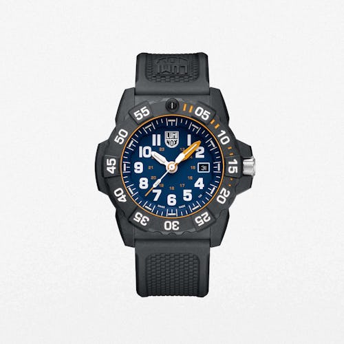 While you can buy a Luminox a case or two over from an engagement ring at Kay Jewelers, the brand’s been making tough-as-nails watches for the likes of the Secret Service, the Israeli Special Forces, the USAF fighter pilots, and the SEALs for years. The 3505’s light but strong carbon case and scratch-resistant mineral crystal will keep up with whatever you’re doing, from diving 200 meters to something a little less risky like mowing the lawn. The self-powered illumination makes it easy to read at night, too.