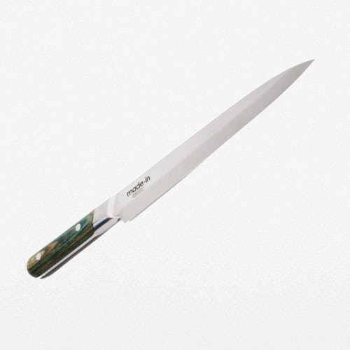 We have this knife. We love this knife. It's a work of culinary art. Yes, it's used when making sushi, but the knife itself is so precise, so well-forged, so damn beautiful, that you'll be hard-pressed to not use when prepping other foods. The handle is evergreen wood. And it enhances the cooking experience of any home chef.