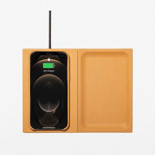 So he's got a phone that's never charged. A bevy of cords that don't make sense. And endless frustration because he can't find his keys. Solve these huge issues in one fell swoop with this valet tray, which is made from Italian leather. It powers up iPhones and AirPods, and has room for his sundries that otherwise go missing.