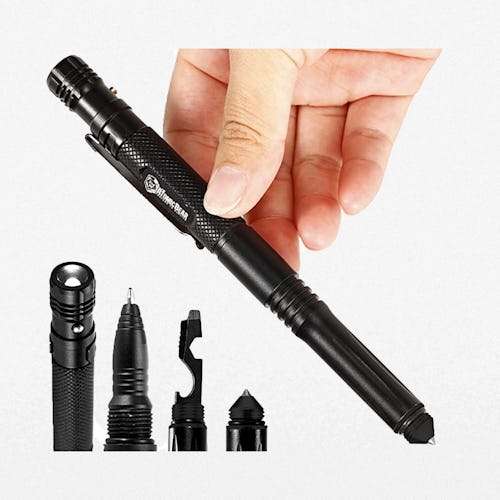 It's OK to have 007 fantasies. This is the tactical pen that goes with them. It's an LED tactical flashlight, a premium glass breaker, a multi-tool, and ballpoint pen, all in one. It weighs 1.4 ounces, or about the same as 28 paper clips.