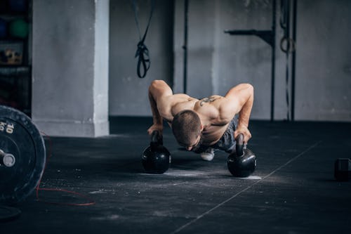 Perform your traditional push-up, but rest one hand on top of the kettlebell. The uneven angle of your body, plus uneven surface for your hand, makes your body recruit other muscle groups for stabilization.