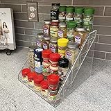 Functional organizer these racks can hold 36 spice jars the 3 step levels make it easy to locate and quickly grab what you need each steps is 3 inches deep providing plenty of room to organize spice jars cans vitamins medicine bottles sauces jelly jars and more Durable and stable built by sturdy steel with powder static electricity spray finished the protective railing and sturdy mesh board on each step will ensure to keep items from slip or fall off