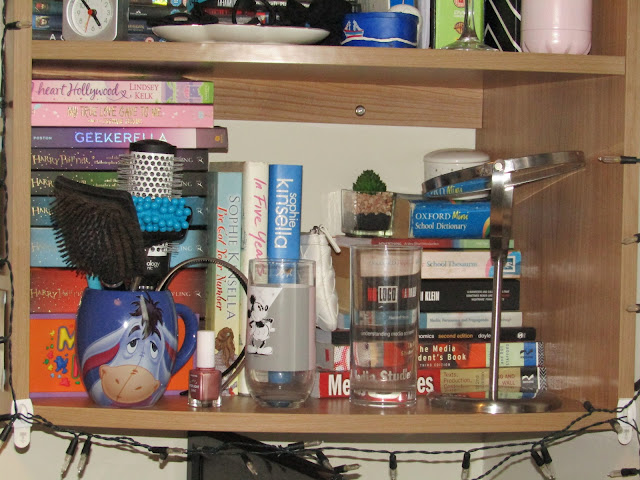 There's three shelves on the wall above my desk which is another handy thing to have. I keep my fairy lights on it which I hung with command hooks and it just makes my bedroom very cute. On this shelf I keep some glasses, my mirror, hairbrushes and my books too.