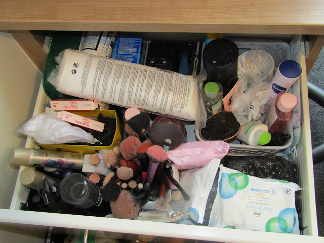 Under my TV there is another drawer where I keep my beauty and skincare stuff. It looks like a mess right now because I haven't really tidied it up but it's convenient to have when I'm sitting at my desk.