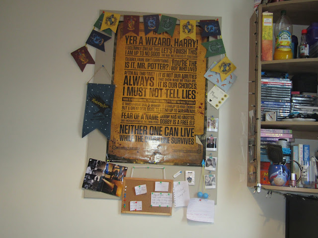 Finally, a favourite part of my room is my pin board where I have a Harry Potter poster and I've pinned up some photos and other decorative stuff. It's also just nice to look at and makes my room feel like mine.