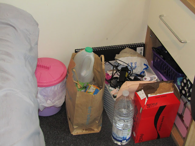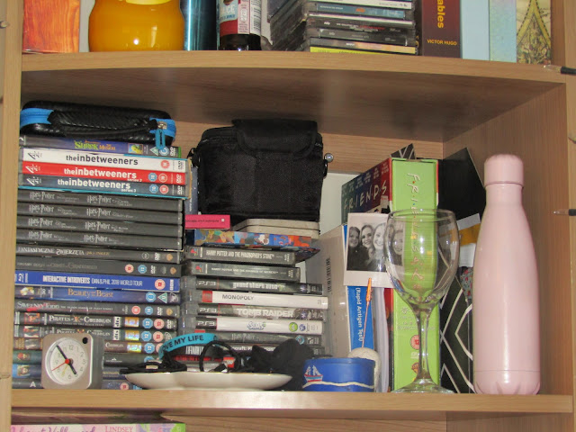 On the second shelf I keep my DVDs and video games as well as a clock, wine glass, my bottle and camera plus some other things too. On the top shelf I have my squash, cereal, soy sauce, lunch box, CDs and photo albums as well as some other decorative items like my Hermione wand. Now in front of my bed I have my bin, a recycling bin which I use a Primark bag, water and a basket with some cleaning things. There's also a bit in the desk where I just keep some hair dryer, makeup and my first aid kit.