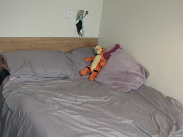 Here is my bed and this is where the magic happens. Just kidding but it's a 3/4 bed and it's the biggest bed I've had and I absolutely love it. It's also really comfy too. I also have Tigger on my bed (don't judge). The best thing though is I have a lamp over my bed but also a dimmer where I can easily turn off my main light from my bed which is honestly the best thing ever.