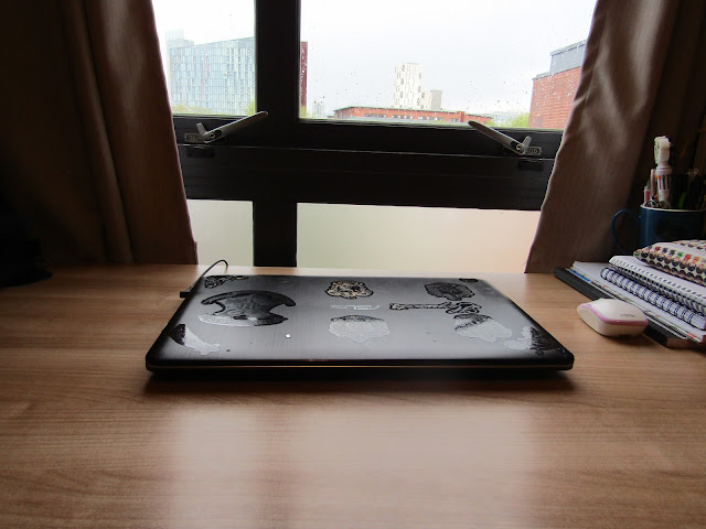 In the middle of my desk I have my laptop. This is where I spend most of my time because that's just what happens when you're a student and everything has been moved online. I do have a nice view when I do my uni work so it is nice.