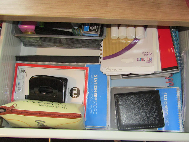 There's three drawers under the coffee station of my desk. Two of the drawers contain my underwear and jumpers but you don't really need to see them. Here in this drawer I just have more stationary stuff like notebooks, hole puncher, sticky notes etc.