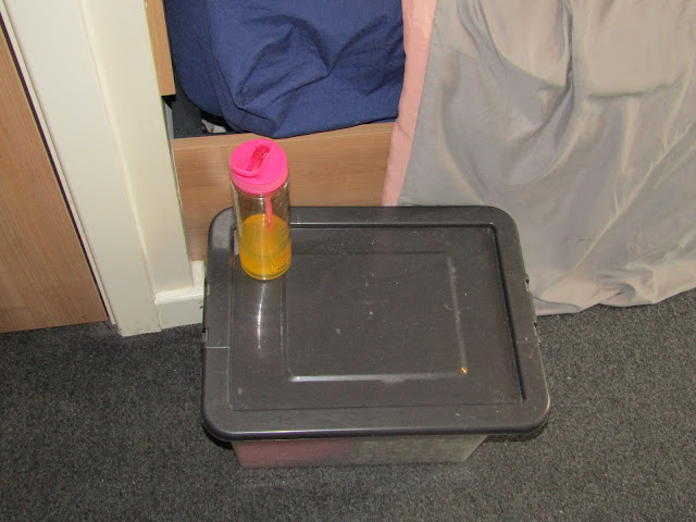 This is a bit random but I have three bottles of water here and that is because the only drinking water is in the kitchen and because I'm lazy sometimes, I find it's easier instead of having to go back and forth to the kitchen to fill up three bottles. I also have a kettle in my room so I also use these bottles of water to fill that up. There's also my extension lead which gets moved from my desk to next to my bed because it's where I charge my phone.