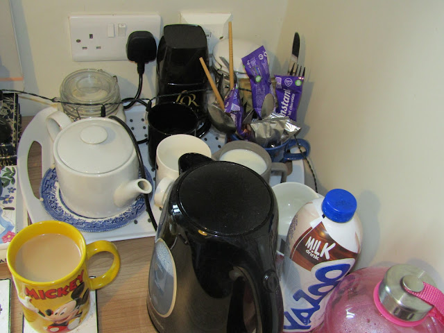 So onto my desk. Here is my coffee and tea station where I usually make my coffee. It's handy having a kettle in my room because not only do I use it for my daily coffee drinking but I use it for food sometimes like pot noodles etc. It's just very handy to have. I also keep a spare cutlery set in my room because the worst thing that can happen in uni is someone stealing your cutlery so always have a spare set in your toom. Also I'm aware I have a lot of mugs too.